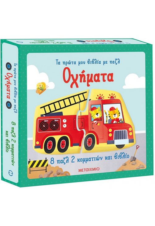 Ένα όμορφο κουτί που περιέχει 8 παζλ 2 κομματιών, καθώς και ένα βιβλίο με στοιχειώδεις πληροφορίες για διάφορα οχήματα